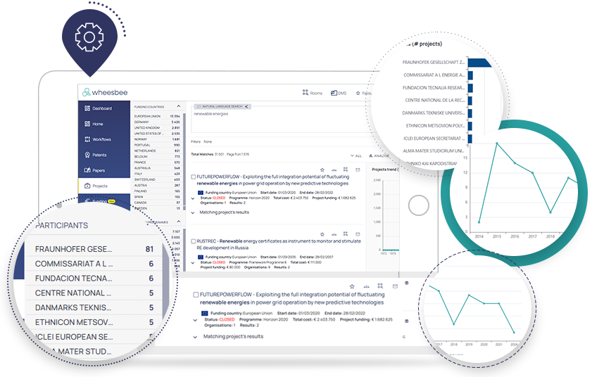 Discovering technologies and trends relevant to the market in which organizations are operating is essential for innovation. Whether you are scouting for specific technologies to address customer or engineering needs, or looking for inspiration for your next product or process, Wheesbee finds technological solutions by analyzing more than 200 million documents and different datasets. Top innovators within your sector are also identified, enabling you to choose which technology to focus on, and with whom it may be worth collaborating.