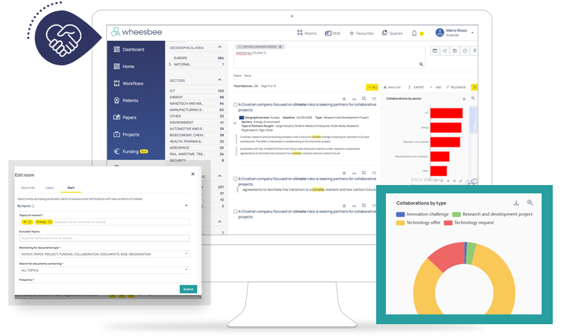 Wheesbee allows you to structure collaborative environments in your organizations, defining projects or areas of interest, sharing information and documents among teams and with external stakeholders, all in a secure and tightly-managed environment. Proactive information searches can be linked to these collaborative environments, and a browser extension makes it possible to share and index web pages relevant for your R&D process. Your collaborative environment can also be linked to your legacy systems (like a DMS), so that you may perform tech-related analysis both on external and internal documents.