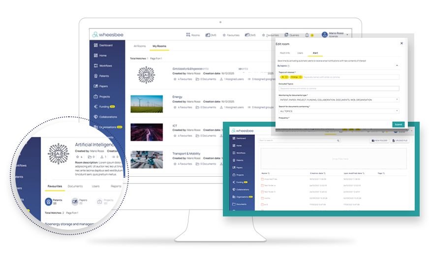 Wheesbee allows you to structure collaborative environments in your organizations, defining projects or areas of interest, sharing information and documents among teams and with external stakeholders, all in a secure and tightly-managed environment. Proactive information searches can be linked to these collaborative environments, and a browser extension makes it possible to share and index web pages relevant for your R&D process. Your collaborative environment can also be linked to your legacy systems (like a DMS), so that you may perform tech-related analysis both on external and internal documents.