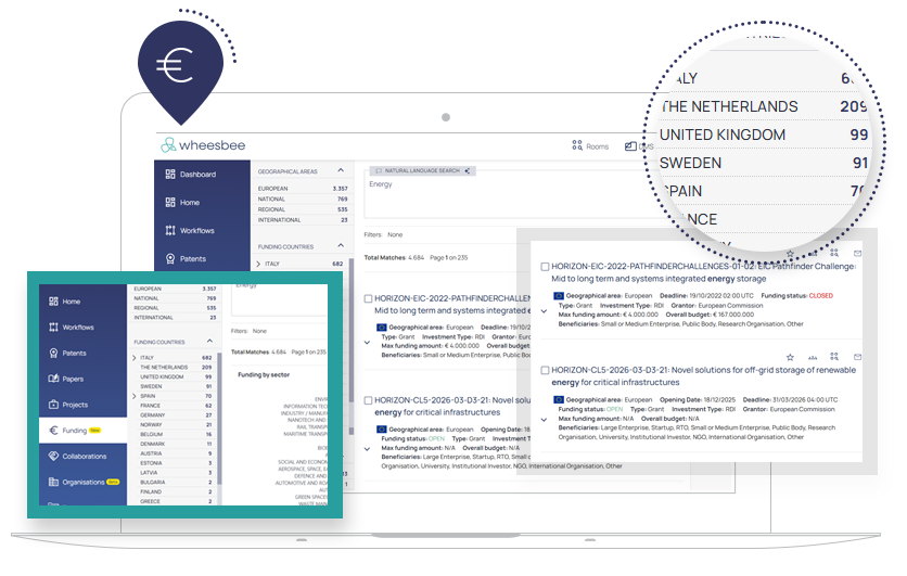 In the R&D processes, one of the major issues always lies in securing appropriate funding. As a matter of fact, a wide range of public funding is available all over the world to support organizations of any type in their R&D processes. In this regard, WheesBee provides a unified database of funding opportunities for R&D projects granted by the European Commission and by a number of national governmental bodies in Europe and overseas. Funding opportunities are described with a fine granularity up to the level of topics, and thanks to Wheesbee’s semantic search you can easily find the grants that better fit your project and your organization.